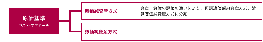 コストアプローチとは、基本的に資産および負債の時価を基準に企業の適正市場価値を算定する方法です。理論的には、評価対象会社が所有する資産の再調達原価を個々に評価し、これを累計することにより総資産の合計額を算定します。 その上で帳簿上ならびに潜在的に存在する負債を差し引くことにより、評価対象会社の株主持分の評価額を算定します。